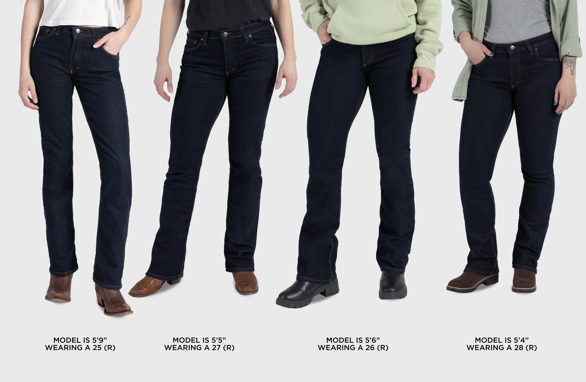 They compare to mid-rise jeans, with a great balance between structure and comfort... they curve naturally without feeling restrictive. The waistband sits securely without digging in, and there’s no awkward gapping in the back, even when I sit down, which is often an issue for me. The back pockets are sized and positioned in the perfect location to complement your “asset” and the cut is flattering through the hips and thighs, with just the right amount of length and taper down the leg to create a clean bootcut fit. I’m 5’4 and 125 lbs., and I usually wear jeans ranging from size 4-6. I prefer my jeans to gather and drape over the sides of my shoes, so I usually order my jeans “long” but the “regular” length in these jeans was perfect for my height.